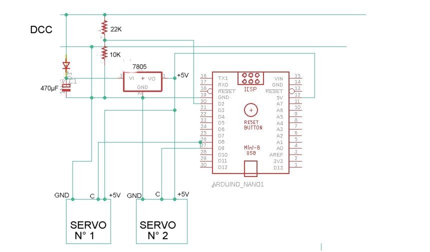 Le montage réalisé permet de commander en DCC deux moteurs d'aiguille à servomoteurs.