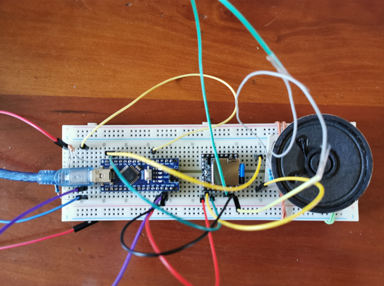 Le bouton poussoir connecté à l'entrée 2 de l'ARDUINO UNO permet de lancer la lecture du fichier audio