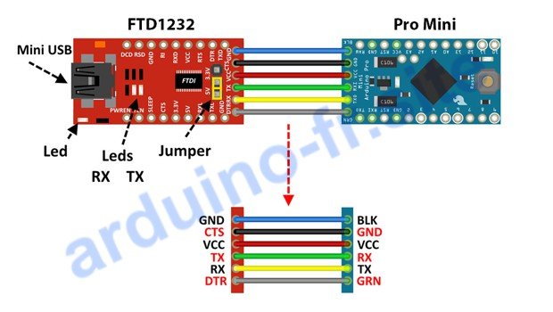Connecter Arduino Pro Mini et FTDI 1232(USB-TTL) suivant le schéma ci-dessous