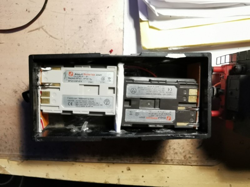 Le décodeur est alimenté par deux batteries Li-Ion de 8 V connectées en série de façon à disposer d'une tension de 16V. Ces batteries ont été installées dans un petit wagon tracté par la loco: