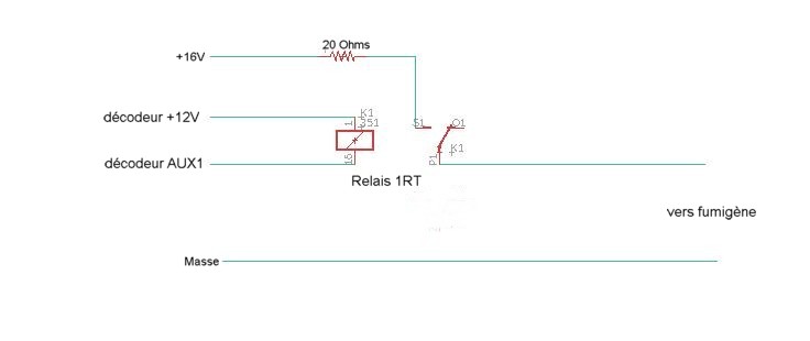 La loco que j'ai achetée d'occasion sur eBay possède un fumigène qui fonctionne avec une tension de 12V et consomme 200 mA. Il n'est donc pas possible de le connecter directement sur une sortie AUX du décodeur. J'ai utilisé un petit relais 12V dont la bobine est reliée aux sorties AUX1 et 12V du décodeur.