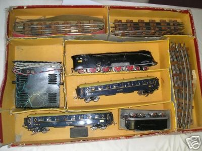 | Type: coffret des années 30 comprenant une loco vapeur 241 avec tender, 2 voitures, un transfo et des rails. Bon état. matériaux: tôle résultats de ventes: 3310 EUR |