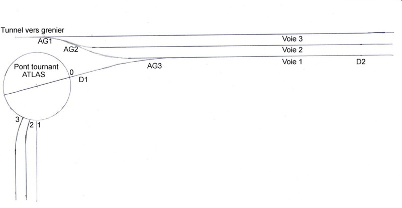 La troisième voie permet d'accéder par l'aiguille AG3 à un pont tournant de la marque ATLAS qui donne accès à 3 autres voies où sont stockées des locos.