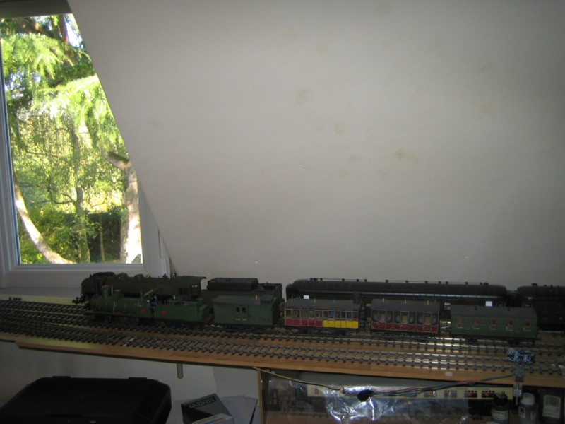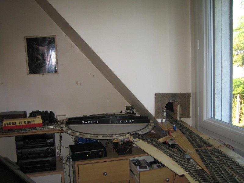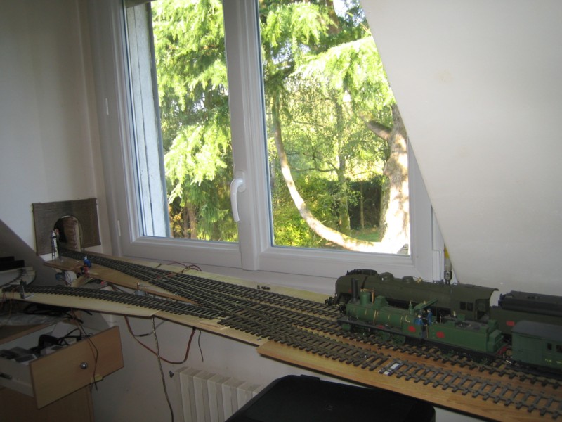 Une voie unique qui traverse le mur relie le réseau modulaire du grenier à un petit réseau installé dans le bureau qui sert de coulisse.