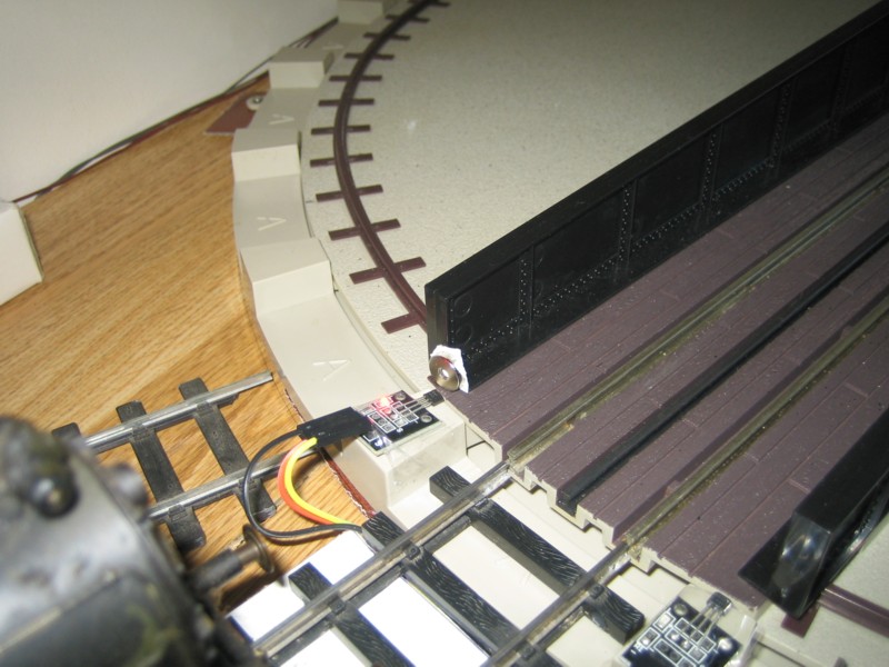 La détection de sortie des voies est réalisée par un petit aimant collé à l'extrémité du tablier du pont et par des capteurs à effet Hall qui sont collés sur chaque sortie de voie comme on peut le voir sur la photo ci-dessous.