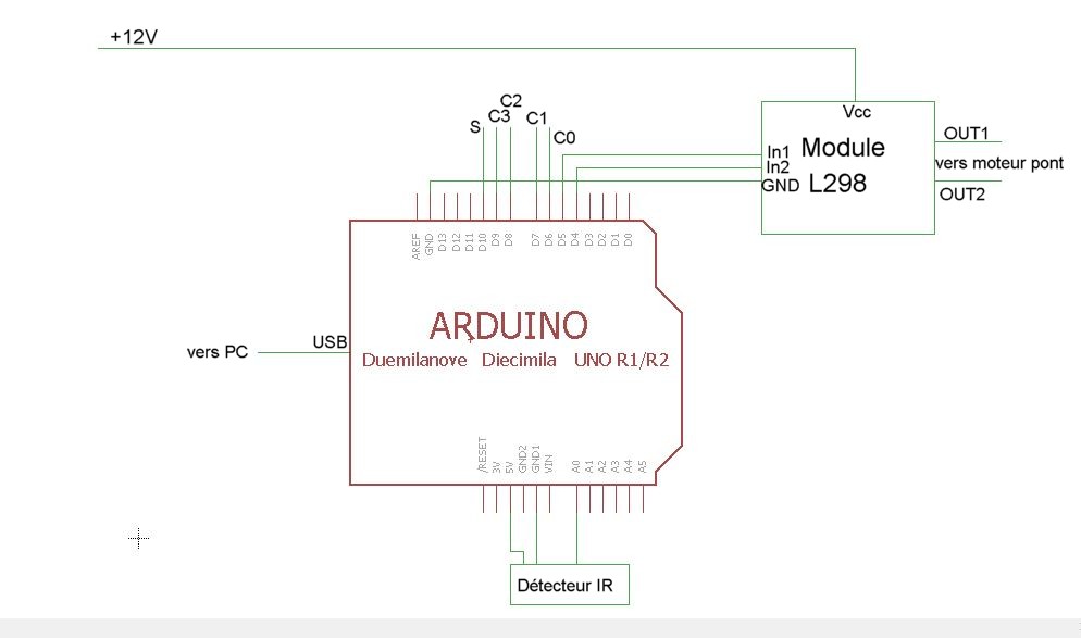 Il est constitué par un Arduino Uno et par un module L298 qui fournit la tension au moteur du pont sur les sorties OUT1 et OUT2. De plus l'Arduino reçoit les signaux des 4 capteurs à effet Hall sur les entrées 5 à 9. La sortie 10 alimente un servo qui commande l'aiguille AG3. Le détecteur de passage à infra rouge qui synchronise les mouvements des locos sur le pont est relié à l'entrée A0. L'ARDUINO est connecté en USB au PC qui pilote le réseau.